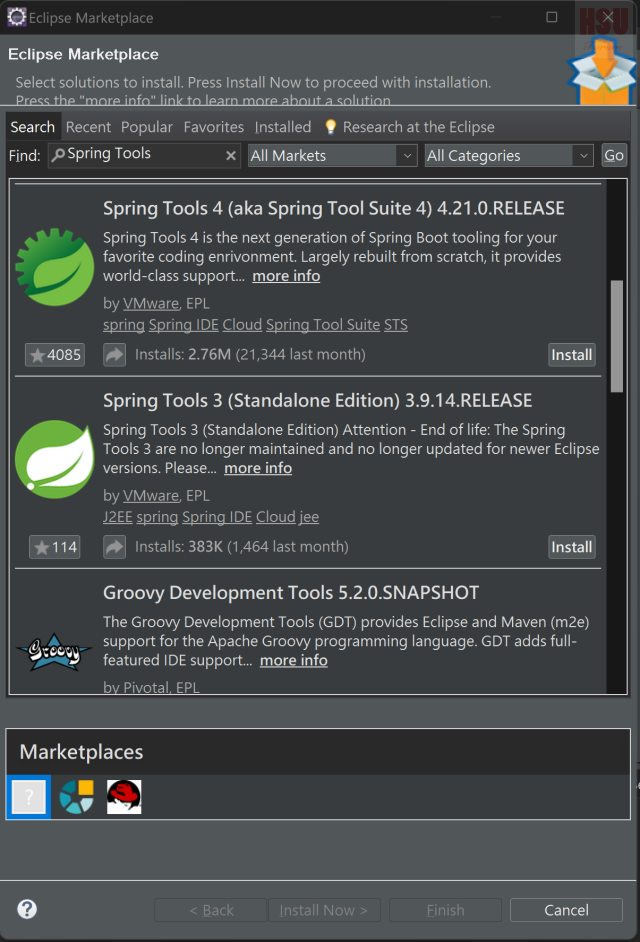 Eclipse之所以廣受Java開發者的歡迎,有很大的因素在於可以使用許多第三方的Plug-in來擴展其功能,像本身因工作常接觸到的Plug-in主要有以下幾個,分別是Spring Tools、JBoss Tools、Oracle Enterprise Pack。 接下來將以安裝Spring Tool來告訴各位如何安裝Plug-in。一開始,我們可以進入Eclipse點選Eclipse Marketplace。 第二步驟,我們在Find輸入Spring Tools,點選Go進行搜尋,搜尋出Spring Tools 4後,點選Install進行安裝