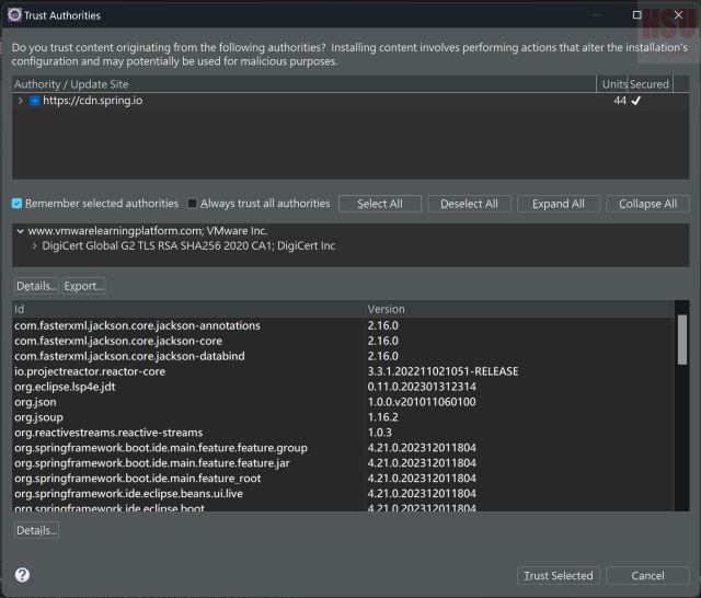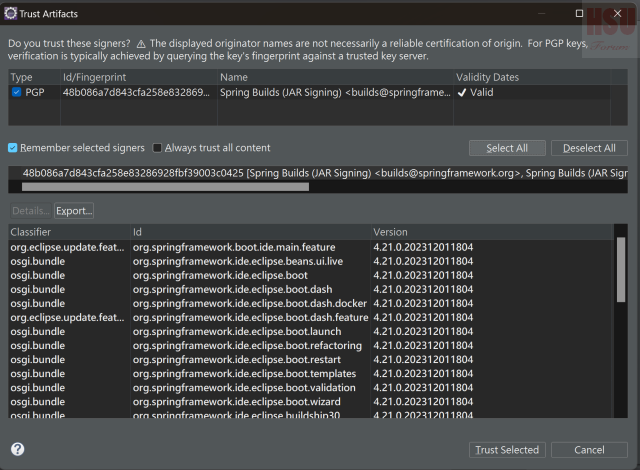 接下來會有2個畫面需要確認憑證資訊,點選Select All並點選Trust Selected接續安裝 最後會看到需要重新啟動Eclipse,按下Yes按鈕即可生效,並完成整個安裝。 |